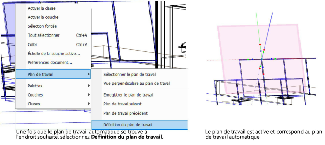 Si le plan de travail automatique est activé, cliquez avec le bouton droit de la souris sur le plan de travail automatique et sélectionnez l’option Plan de travail > Définition du plan de travail (ou sélectionnez Outils > Plan de travail > Définition du plan de travail). Le plan de travail est alors placé selon l’orientation du plan de travail automatique et devient actif.