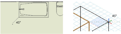 Cette attirance s’applique uniquement au deuxième point d’un segment de rappel à deux points, tout comme lorsque vous dessinez une ligne ou un polygone. Lorsque vous générez une attirance pour certains angles, le curseur intelligent trouve les angles définis dans les préférences et, par défaut, également les angles relatifs aux axes horizontaux et verticaux. Il détecte également l’angle de rotation d’un plan (module d’extension Vectorworks requis); les éléments créés selon cet angle lorsque vous vous trouvez dans une vue Plan 2D pivotée, apparaît à l’horizontal lorsque vous vous trouvez dans une vue non pivotée avec des unités réelles.