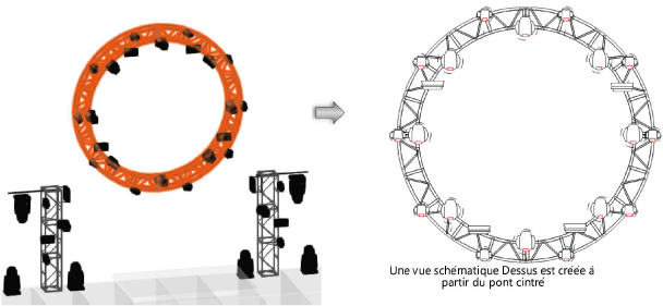Dans une vue schématique, les projecteurs et autres charges peuvent être ajoutés, supprimés et repositionnés (voir Gérer les charges pour plus d’informations).