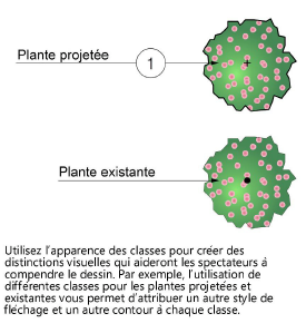 Par exemple, vous pouvez choisir d’établir différentes classes afin de créer des apparences distinctes pour les plantes existantes et projetées ou différents styles d’étiquette pour mettre l’accent sur des options ou phases alternatives ou sur des dessins à différentes échelles.