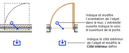 Le sens d’ouverture des portes ou leur orientation dans le mur peuvent être gérés de façon interactive en vue Plan 2D lorsque vous insérez une porte à l’aide du mode Insertion simple, ou par la suite à l’aide de l’outil Sélection. Les indicateurs vous permettent de définir facilement l’orientation de la porte et, lorsque vous éditez une porte, de modifier son Côté intérieur de façon interactive dans le dessin. Les paramètres de la porte sont mis à jour automatiquement pour refléter les valeurs de la porte dessinée, et vous permettre d’obtenir des données IFC précises.