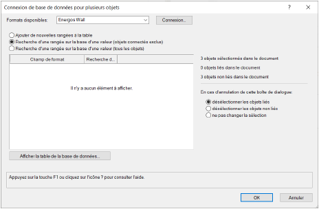 À droite, le statut des objets liés vous indique le nombre d’objets sélectionnés ont retrouvé des données dans les tables de la base de données à partir de cette recherche. Lorsque des objets sont liés, leurs champs de base de données sont connectés à la table de la base de données.