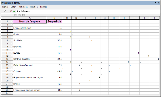 Créez la matrice de proximité : toutes les deux lignes de données, vous introduisez les données sur le nom et la surface des espaces ; dans les lignes intermédiaires, vous mettez les données de proximité.