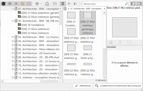 Dans la Barre des modes, cliquez sur la liste Style de mur et sélectionnez un mur extérieur générique dans le Sélecteur de ressources. La plupart des styles de mur disponibles dans la bibliothèque sont liés à des niveaux de référence. Pour modifier leur hauteur, éditez le style et sélectionnez Hauteur par défaut des murs comme Limite supérieure et Altitude du calque comme Limite inférieure. Assurez-vous également que l’option Par rapport au mur soit sélectionnée pour le haut et le bas de chaque composant. Double-cliquez ou cliquez sur Sélectionner pour choisir le style de mur.
