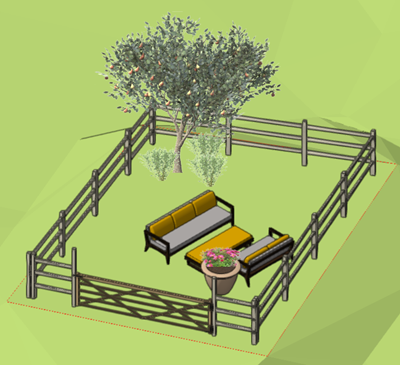 Passez à la vue Plan 2D en la sélectionnant dans la liste Vue actuelle/Vues standard de la Barre d'affichage, ou en appuyant sur la touche 0 du pavé numérique. (Vous pouvez également placer une clôture dans une vue 3D, mais c'est plus facile en Plan 2D). Ajoutez une clôture autour du périmètre du jardin. Activez l'outil Clôture