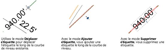 Les étiquettes sont distribuées régulièrement sur les courbes de niveaux principales. Ce n’est parfois pas souhaité et une étiquette doit être déplacée. Lorsqu’un modèle de terrain est sélectionné, deux modes supplémentaires sont disponibles pour l’outil Ajustement. Ces modes vous permettent de repositionner, ajouter ou supprimer les étiquettes des courbes de niveau.