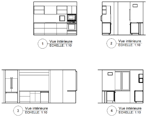 La commande Créer des viewports d’élévation intérieure vous permet de créer des viewports représentant quatre vues d’élévation intérieure d’une pièce ou d’un espace de votre modèle. Les viewports d’élévation intérieure sont une sorte de viewport de coupe verticale, mais au lieu de créer une coupe d’une espace, vous créez des lignes de coupe pourvues de prolongements définis par les murs qui entourent le marqueur d’élévation intérieure. La coordination automatique du dessin entre le marqueur et les viewports associés est maintenue tant que les viewports se trouvent sur la même planche de présentation ou sur le même calque de dessin sur laquelle/lequel ils ont été créés.