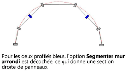 Cette option est uniquement d’application sur les murs-rideaux courbes avec des profilés d’une hauteur totale. Cochez cette option afin d’obtenir un effet courbe pour un mur avec des panneaux droits qui forment un arc de cercle. En décochant cette option pour certains profilés normaux ou châssis d’angle dans un mur-rideau, vous pouvez créer un segment droit qui ne suit pas la courbe, pour avoir un panneau de verre droit faisant partie du mur courbe.