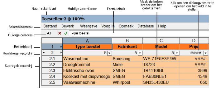 In dit voorbeeld bevat rekenbladrij 1 de titels voor de recordkolommen. De hoofdregel van recordrij 2 is zo ingesteld dat alle tekenobjecten worden opgesomd waaraan het record ‘toestel’ is gekoppeld. De subregels 2.1 tot en met 2.5 staan voor de vijf objecten in de tekening die voldoen aan deze criteria.