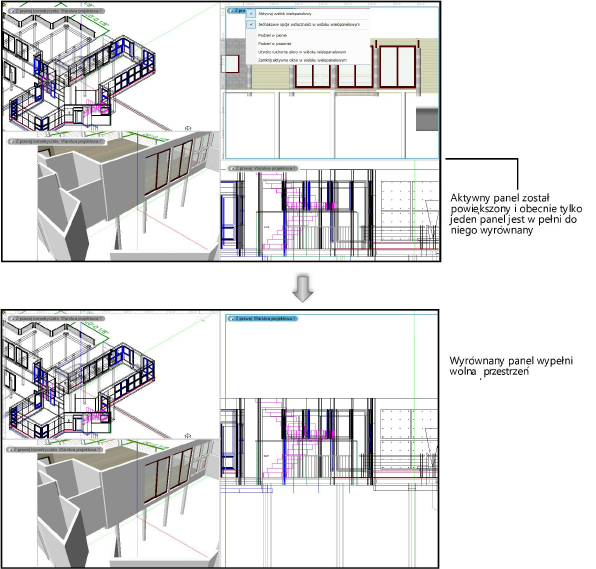 Jeżeli aktywny panel widoku graniczy z wieloma panelami, które są do niego wyrównane, użytkownik nie może zdecydować, który panel wypełni pusty obszar po zamknięciu aktywnego panelu. Aby mieć pewność, że układ paneli (widoku wielopanelowego) będzie odpowiadał naszym oczekiwaniom, należy aktywny panel powiększyć lub pomniejszyć przed jego zamknięciem.