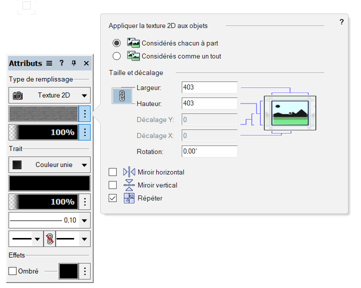 Une fois une texture 2D appliquée à un objet, elle peut être personnalisée pour l’objet en question sans que la ressource d’origine ne soit modifiée. Pour ce faire, utilisez la fenêtre contextuelle des préférences du remplissage dans la palette des Attributs ou l’outil Éditer attributs. Si le remplissage d’un objet est édité avec l’outil Éditer attributs les modifications apparaissent dans la fenêtre contextuelle de la palette des Attributs. À l’inverse, lorsque vous effectuez des modifications dans la palette des Attributs, celles-ci apparaissent au niveau de l’objet.