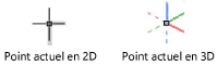 L’indicateur du point d’attirance actuel apparaît en noir dans une vue 2D. Dans une vue 3D, l’indicateur s’affiche avec les couleurs rouge, vert et bleu correspondant aux axes rouge (X), vert (Y) et bleu (Z). L’orientation de l’indicateur dans une vue 3D est relatif au plan de travail; les pointillés indiquent les axes négatifs.