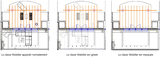 La classe « Mobilier » inactive est visible (à gauche), grisée (au milieu) et masquée (à droite)