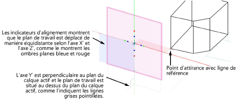Manipulez le plan de travail en le faisant pivoter autour d’un des trois axes (X', Y' ou Z') ou en déplaçant l’origine du plan de travail. Le plan de travail peut être déplacé mais pas pivoté dans une vue Plan 2D pivotée (module d'extension Vectorworks requis). Voir Rotation du plan. Vous pouvez également utiliser des commandes pour travailler avec les plans (voir Commandes du plan de travail).