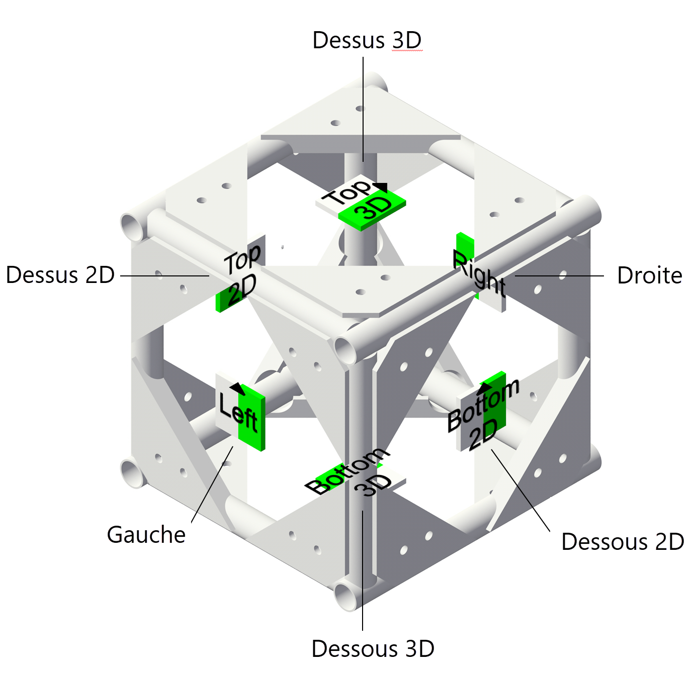 Les options correspondent aux six types de connexion d’un angle de pont sur mesure, montrés ici dans une vue isométrique. |