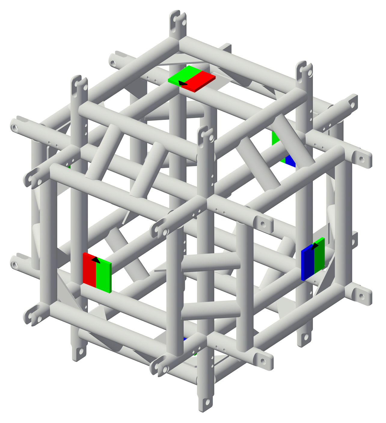Les symboles de ponts dans la bibliothèque Vectorworks utilisent des aimants pour définir leurs options de connexion. Les aimants sont situés sur le composant 3D du symbole, à chaque point de connexion. Ils sont placés dans la classe Rigging-Truss-Magnet, masquée par défaut.