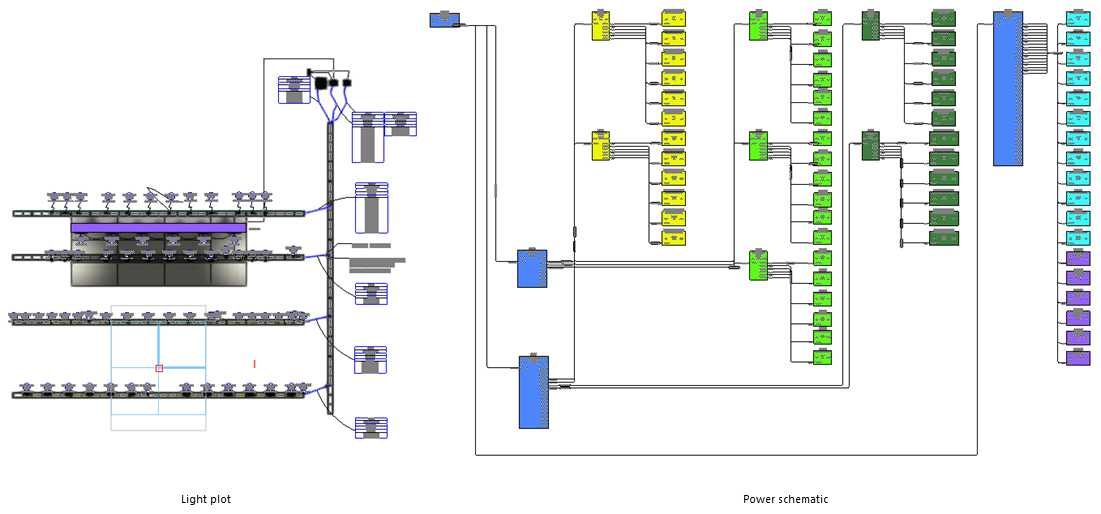 Un schéma de distribution électrique consiste en une vue schématique de tous les objets d'un plan de feu qui participent aux calculs de puissance électrique. Le plan de feu et le schéma de distribution électrique montrent les mêmes objets, mais de manière différente. Les plans de feu sont des dessins à l'échelle du monde physique. Les schémas, quant à eux, sont conçus pour illustrer le flux des signaux. Cette fonctionnalité combine l'expertise de Spotlight en matière de plans de feu et les possibilités de ConnectCAD en matière de schémas.