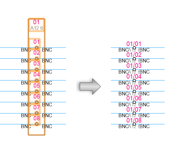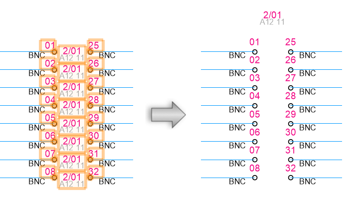 Généralement, ConnectCAD représente des bornes (bornes de connexion, bornes de terminaison, etc) comme un élément séparé, chacune portant le même nom et un connecteur. Cela vous permet de placer ces bornes à différents endroits dans le schéma afin d’illustrer le flux du signal. Cependant, il peut être pratique de combiner ces bornes en un seul bornier contenant plusieurs connecteurs. Ces commandes vous permettent de passer de bornes multiples à un seul bornier, et inversement.