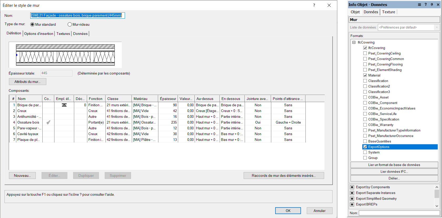 Dans le fichier IFC, le mur est représenté par trois entités différentes : deux IfcCoverings, IfcWallStandardCase, et IfcBuildingElementProxy. Le composant est marqué par « Air Gap » si sa fonction n’est pas exportée.