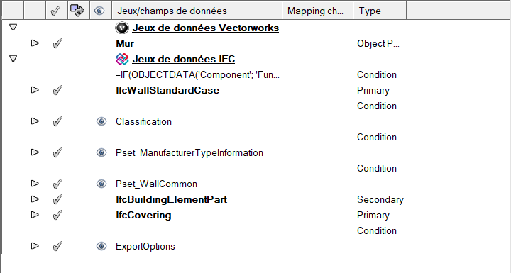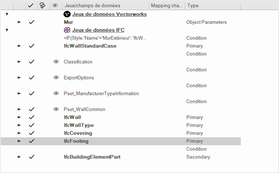 Par exemple, vous pourriez avoir un fichier avec quatre styles de mur : MurExtérieur, MurIntérieur, Fondations, et MurVirtuel. Dans le mapping des données pour l’objet paramétrique, nous ajoutons deux nouvelles entités primaires : IfcCovering et IfcFooting. À l’aide du champ Condition, on définit une règle pour mapper l’entité IFC adéquate par style de mur.