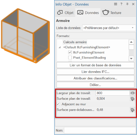Dans cet exemple, le format de base de données « Calculs armoire » a été créé et ajouté en tant que jeu de données pour l'objet paramétrique Armoire.