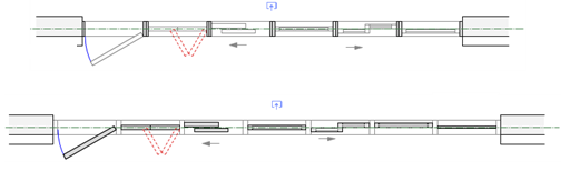 Cadres fournis par l'assemblage avec une Référence de décalage élément du centre du cadre d'assemblage (en haut) et de la face extérieure du cadre d'assemblage (en bas). Le paramètre Insertion relative à de l'assemblage est réglé sur la face extérieure du cadre. Notez que seules les éléments se déplacent lorsque le paramètre Référence de décalage élément change.