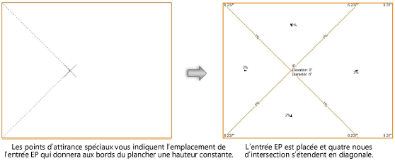 Si vous déplacez le curseur sur le plancher, des points d’attirance spéciaux apparaissent pour faciliter le placement des entrées EP afin que vous obteniez des bords placés à une hauteur constante. Vous ne devez pas placer les entrées sur un point d’attirance, mais si vous placez l’entrée EP à l’emplacement d’un point d’attirance sur un plancher où aucune entrée n’est encore placée, les pentes qui en résulteront donneront une hauteur constante pour au moins quelques unes des arêtes à partir des coins désignés.