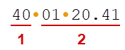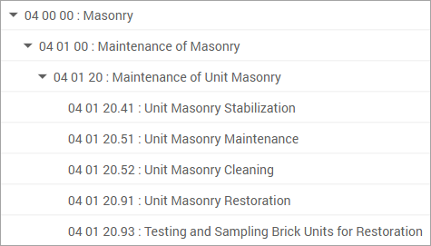 Lorsque vous importez une norme de classification au format texte ou Excel, vous pouvez spécifier la hiérarchie des codes dans la boîte de dialogue « Référence de la norme de classification ». Une hiérarchie à deux niveaux serait suffisante pour un petit ensemble de codes, mais vous pourriez avoir besoin de niveaux supplémentaires pour une norme étendue avec des centaines de codes. Les exemples ci-dessous montrent comment analyser la norme de classification MasterFormat présentée ci-dessus en deux ou quatre niveaux. Les espaces dans l'exemple de code sont représentés par des points orange.