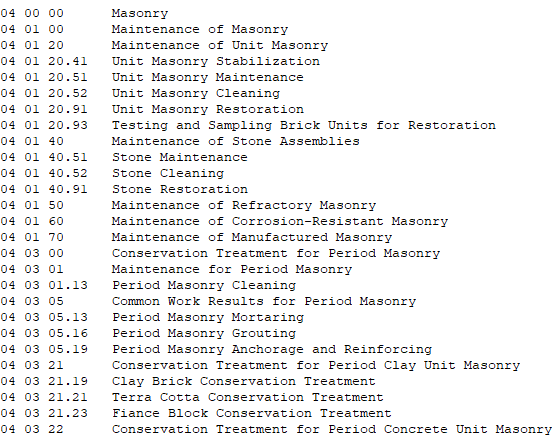 La première étape de la classification automatique consiste à importer les normes de classification nécessaires à votre projet, telles que MasterFormat ou Uniclass. Ces fichiers doivent être au format texte délimité par des tabulations (.txt), au format Excel (.xls) ou au format .xml, avec deux colonnes. Le fichier doit être trié par code de classification (première colonne). La deuxième colonne contient une brève description du code. Vous trouverez ci-dessous comme exemple un extrait d'un fichier texte MasterFormat. Les espaces sont représentés par des points orange et les tabulations par des flèches orange.