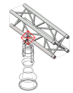 Lors de l'insertion de charges sur des ponts créés avec l'outil Pont, les câbles et les élingues s'accrochent au milieu du pont. Les objets tels que les projecteurs, les haut-parleurs, les écrans vidéo, etc. s'accrochent aux tubes. S'il y a plusieurs tubes superposés, lors de l'insertion en vue Plan 2D, l'objet inséré se trouvera sur celui du bas. Appuyez sur la touche Alt (Windows) ou Cmd (Mac) tout en insérant l'objet pour l'accrocher au tube le plus haut orienté vers le haut. Toutefois, si des objets sont déplacés ou dupliqués, ils s'accrocheront au tube le plus proche.