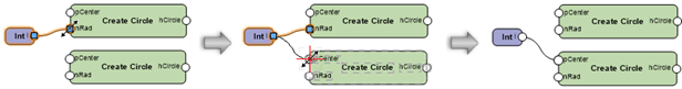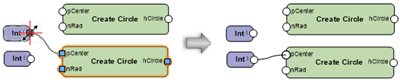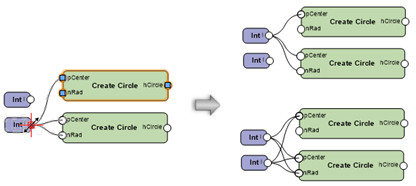 Appuyez sur la touche Ctrl (Windows) ou Cmd (Mac) et gardez-la enfoncée pendant l’opération pour déplacer tous les fils connectés d’un port à un autre port (en haut), ou la touche Alt pour dupliquer les fils et les connecter à un autre port (en bas) Les fils peuvent être déconnectés uniquement du nœud qui n’est pas sélectionné.