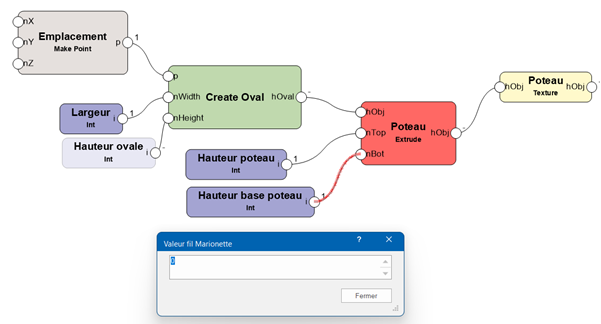 Les deux ports sont connectés par un fil. La sortie d’un nœud peut être connectée à plusieurs entrées d’autres nœuds. Inversement, une seule entrée peut être connectée à plusieurs sorties.