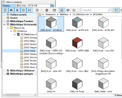 Les vignettes des matériaux dans le Gestionnaire des ressources vous donnent des informations pour vous permettre de sélectionner le matériau adéquat.