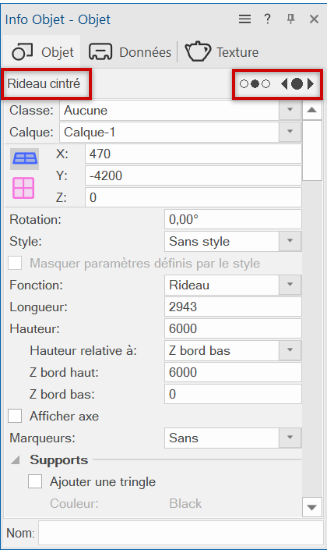 La palette Info Objet vous fournit des informations sur les objets sélectionnés dans un dessin Vectorworks et vous permet d’en modifier les paramètres. Les informations qui s’affichent dans la palette Info Objet dépendent du type d’objet sélectionné. Le champ Nom vous permet de saisir un identifiant optionnel pour l’objet sélectionné.