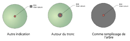 La zone racinaire (ZR) fait référence à la zone circulaire autour de la base de l'arbre, exigée pour la stabilité structurelle de l'arbre. L’apparence de l’indicateur de la ZR est définie dans la palette des Attributs. |