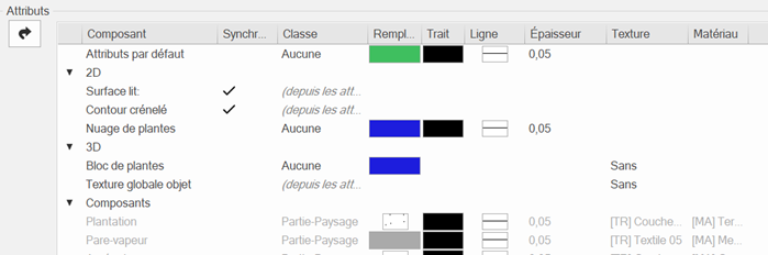 Sélectionnez la surface plantée de la pelouse de toit, faites défiler la palette Info Objet jusqu'à la zone Attributs graphiques.