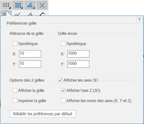 Pour l'instant, les axes 3D sont gênants. Nous allons les masquer. Double-cliquez sur Attirance de la grille dans la zone des outils d’attirance de la Barre d'affichage. Dans le fenêtre contextuelle « Préférences grille », désélectionnez Afficher les axes 3D.