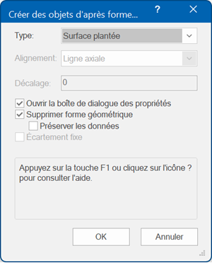 Sélectionnez la polyligne si elle n'est pas déjà sélectionnée. Sélectionnez la commande Créer des objets d'après forme géométrique. Dans la boîte de dialogue « Créer des objets d'après forme géométrique », choisissez Surface plantée comme Type. Sélectionnez les options pour Ouvrir la boîte de dialogue dialogue des propriétés et Supprimer forme géométrique.