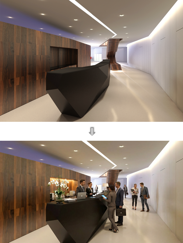 Demandez au Visualiseur IA d'ajouter des personnes dans l'espace. Les instructions détaillées doivent inclure la préservation de l'architecture, de l'éclairage et du mobilier tels qu'ils sont, et décrire également les détails concernant les personnes, par exemple si elles doivent être en tenue décontractée ou professionnelle, derrière ou devant le comptoir, marchant dans l'espace, discutant en petits groupes, et ainsi de suite.