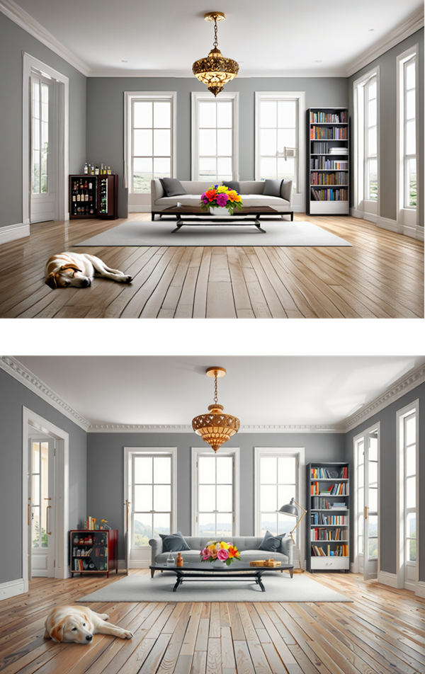 L'amélioration des détails permet d'affiner à la fois l'image originale et les objets intégrés tels que le chien, les fleurs et la bibliothèque.