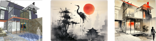 Vous pouvez éventuellement utiliser une ou deux images de Vectorworks ou une image importée pour fournir un contexte à la génération de l'image. Les images sources s'affichent ici. Ces prompts peuvent guider la composition de l'image générée, de sorte que vous pouvez utiliser un dessin créé dans Vectorworks comme base de l'image. Ils peuvent également fournir des éléments de style tels que des textures ou des couleurs spécifiques ou un mood board, fournir des affiches à ajouter à une image, etc. Le Visualiseur IA détecte les bords, les couleurs et les textures si des prompts d’image sont utilisés, afin d'en déduire la composition et les matériaux. Par exemple, une zone verte près du bas de l'image est interprétée comme de l'herbe. Le paramètre Prompt d’image 1, lorsqu'il est utilisé, définit également le rapport d'aspect de l'image générée. Si aucun prompt d’image n'est utilisé, une image est générée en fonction du prompt textuel et d'autres paramètres. Pour utiliser une image à partir d'un fichier Vectorworks, sélectionnez un viewport sur planche de présentation ou une image, ou définissez la vue souhaitée sur un calque de dessin (à utiliser pour une capture d'écran) et cliquez sur Rafraîchir. Pour importer une image, cliquez sur Importer et sélectionnez le fichier image souhaité. L'image actualisée ou importée apparaît. Pour effacer l'image et générer à partir d'un prompt uniquement, cliquez sur Vider. Utilisez cette option en combinaison avec les prompts et d’autres options, pour influencer la génération de l’image. Un prompt textuel d’au moins un mot est requis. |