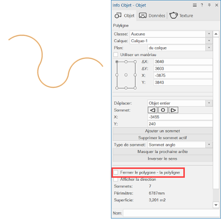 Utilisez l’option Fermer le polygone - la polyligne dans la palette Info Objet pour modifier l’état actuel de l’objet.