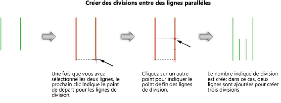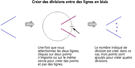 Cliquez pour définir le point de départ et le point de fin des lignes de division. Une ligne perpendiculaire (pour des lignes parallèles) ou un cercle (pour des lignes en biais) vous indiquent le côté le long duquel commenceront et s’arrêteront les lignes de division. Si le point de départ et de fin se trouvent sur la même ligne ou sur le même cercle, l’outil crée des points et pas des lignes.