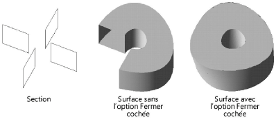Cochez cette option pour créer une surface selon les sections fermées. Comme le point de départ et le point d’arrivée ne peuvent coïncider, l’option Fermer ferme automatiquement la surface.