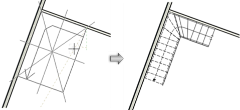 Le mode Incliné vous permet de dessiner des escaliers sur la base de rectangles pivotés. Utilisez les attirances des objets de construction à proximité pour placer précisément les limites extérieures de l’escalier. Si vous désirez définir certains paramètres géométriques pour l’escalier, commencez par les indiquer dans la boîte de dialogue « Préférences escalier ». Les dimensions globales de l’escalier (Largeur escalier, Longueur extérieure, Longueur, etc.) s’ajustent pour correspondre aux limites extérieures dessinées de l’escalier et les autres paramètres géométriques restent inchangés dans les préférences, si possible, lorsque l’outil Escalier (détaillé) calcule l’escalier.