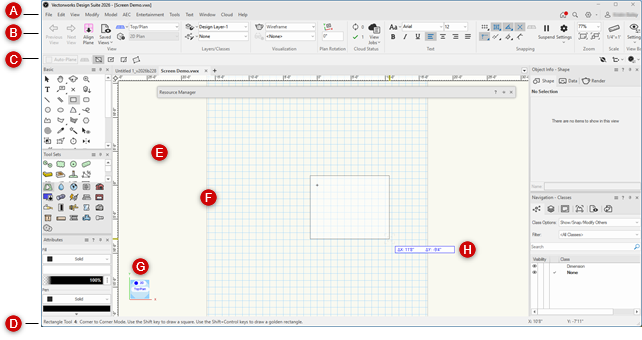 Cette barre prend toute la largeur de la fenêtre du programme et contient des menus déroulants qui permettent d'accéder aux commandes de Vectorworks, un bouton pour alterner entre l’Écran d'accueil et la zone de travail ainsi que les commandes pour la recherche rapide, l’apparence de la Barre d’affichage et la connexion au compte Vectorworks (voir Écran d’accueil et Recherche rapide). |