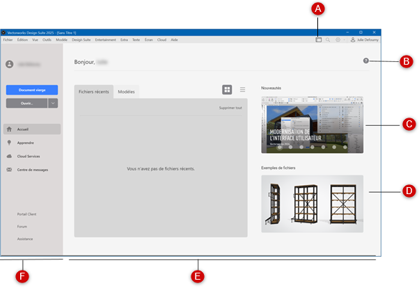 A : Cliquez pour passer de l’Écran d’accueil à la zone de travail (programme principal) et vice-versa. B : Cliquez pour ouvrir l’aide en ligne. C : Cliquez pour accéder aux informations sur les nouvelles vidéos, les fonctionnalités, les événements, les webinaires, etc. D : Cliquez pour ouvrir des fichiers d'exemple sur Vectorworks University E : F : |