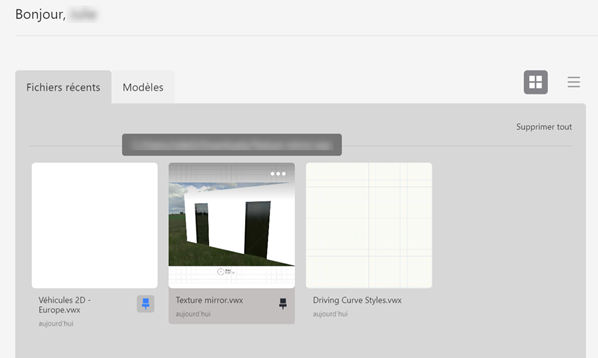 Par défaut, les fichiers s'affichent dans l’ordre alphabétique, mais vous pouvez épingler des fichiers pour qu'ils s'affichent en premier dans l'onglet. Les fichiers épinglés affichent une épingle en surbrillance. Lorsque plusieurs fichiers sont épinglés, ils apparaissent dans l'ordre de leur dernière utilisation. Maintenez le curseur sur un fichier pour afficher son emplacement. Dans la vue Grille, le fait de maintenir le curseur sur le fichier affiche également le menu dans le coin supérieur droit du fichier et, pour les fichiers non épinglés, une épingle noire. Cliquez dessus pour épingler le fichier et le déplacer plus haut dans la liste. Le menu et l'épingle sont toujours visibles dans la vue Liste. Dans la vue Liste, la taille du fichier apparaît également. Cliquez sur un fichier pour créer un nouveau fichier VWX qui utilise le modèle sélectionné |