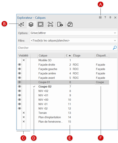 A : Menu de la palette (les commandes varient selon l'onglet actif) B : Onglets (Classes, Calques, Planches de présentation, Viewports, Vues enregistrées Références externes) C : Paramètres de visibilité D : Classe/calque actif(ve) (onglets « Classes », « Calques » et « Planches de présentation » uniquement) E : Ordre d’empilement (onglets « Calques » et « Planches de présentation » uniquement) |