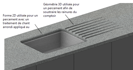 Pour un comptoir avec un évier et une planche d'égouttage personnalisée, un percement utilisant une combinaison de géométries 3D et 2D peut être utilisé.